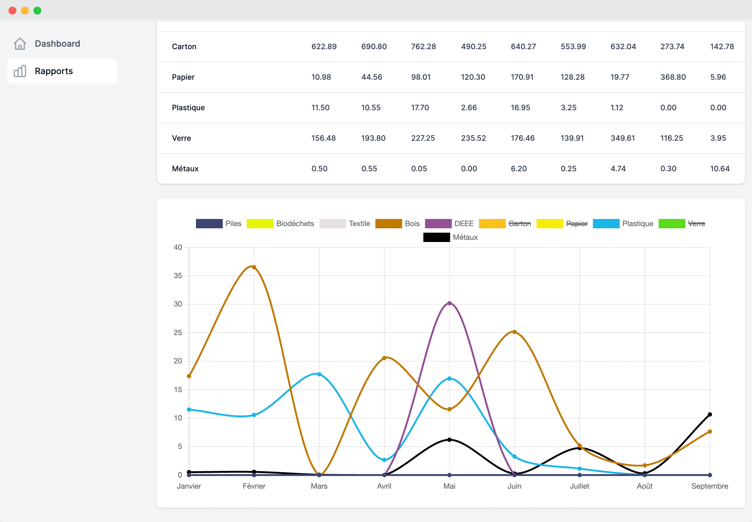 Un tableau de bord récapitulant tous les poids par type de déchets que nous avons collecté jusqu'à présent.